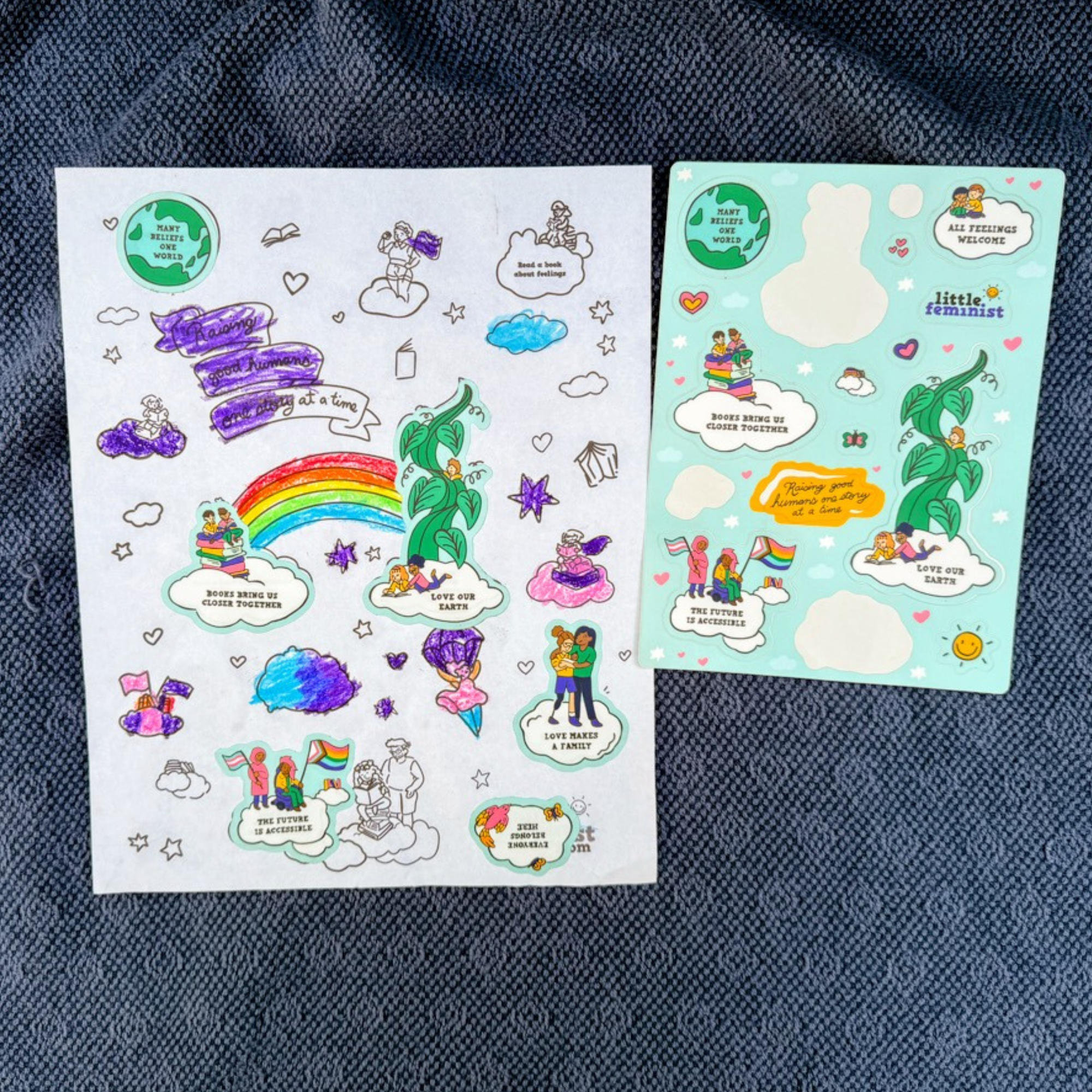 This set includes ONE illustrated Little Feminist sticker sheet and ONE matching coloring page—designed to spark creativity, conversation, and connection.